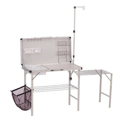 Imagine unpacking a whole kitchen structure out of a compact carry case! Unpack the Coleman Packaway Deluxe Camp Kitchen, and you have stable counter space for food-preparation, a separate grilling area, a removable washing tub, and storage for utensils, spices, supplies and more. The Deluxe Kitchen features a wire-grid side shelf that fits all Coleman stoves, bringing the stove up to countertop l